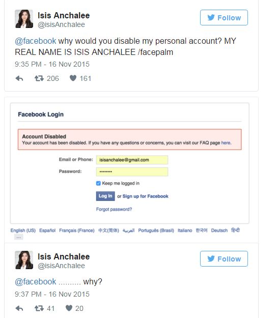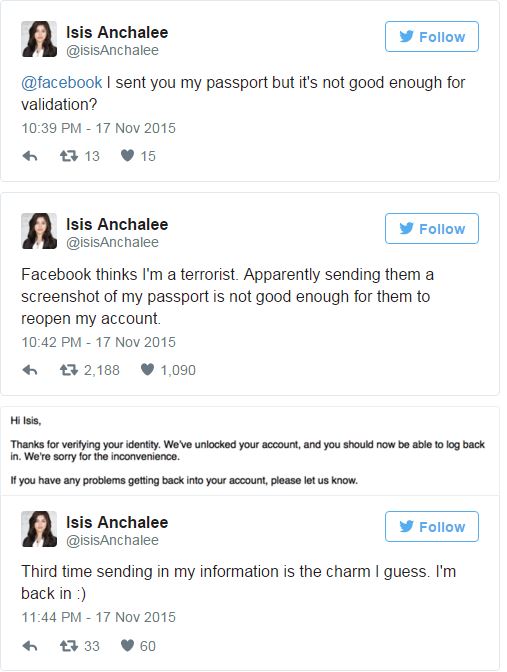 Μια γυναίκα που ονομάζεται Isis αποκλείστηκε από το Facebook,γιατί το μέσο κοινωνικής δικτύωσης νόμιζε ότι ήταν τρομοκράτης.Η Isis Anchalee εκδήλωσε την αναστάτωσή της στο Twitter όταν βρήκε ότι ο λογαριασμός της ήταν μπλοκαρισμένος – λόγω του ότι το πραγματικό της όνομα παραπέμπει σε αυτό της οργάνωσης των τζιχαντιστών.