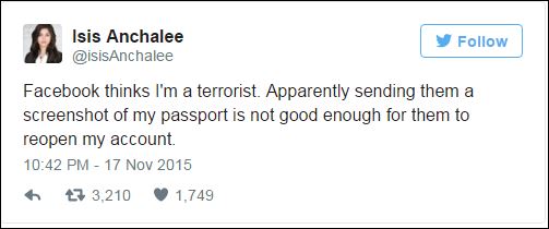 Η κα Isis Anchalee που έχει το ίδιο όνομα με την αιγυπτιακή θεά του ουρανού – καθώς και με μια τρομοκρατική ομάδα ισχυρίστηκε ότι το Facebook έκλεισε το λογαριασμό της και αρνήθηκε να το ανοίξει και πάλι, ακόμη και όταν η Isis τους έστειλε το διαβατήριό της για να εξακριβώσουν τα στοιχεία της.