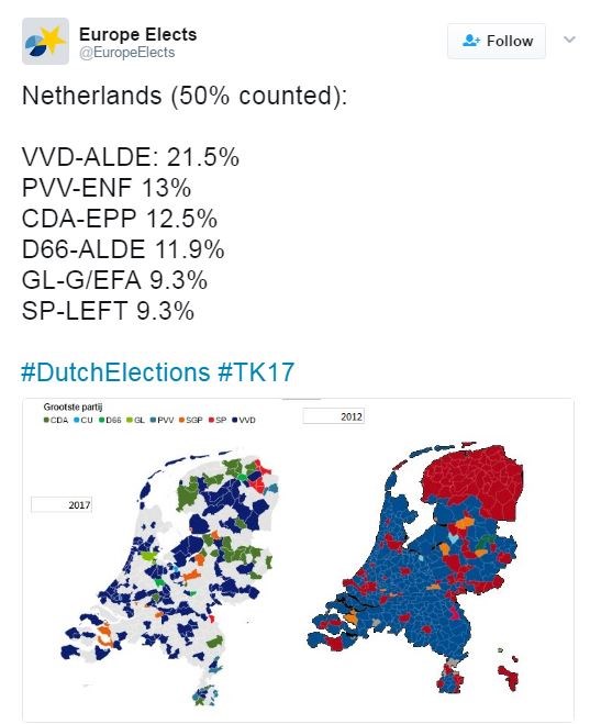 Με καταμετρημένο το 50% των ψήφων το κόμμα του Μαρκ Ρούτε, είναι πρώτο με ποσοστό 21,5%, το κόμμα του Βίλντερς είναι στο 13%, ενώ οι Χριστιανοδημοκράτες βρίσκονται στο 12,5%.
