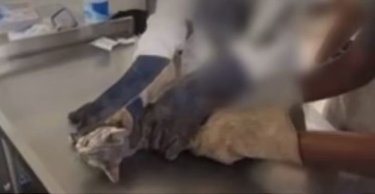 Οι μαθητές φαίνονται να κρατούν κάτω την γάτα, να την γυρίζουν ανάσκελα και να προσπαθούν να συρράψουν την τομή. Όλα αυτά συνέβαιναν την ώρα που η γάτα ούρλιαζε από τον πόνο.