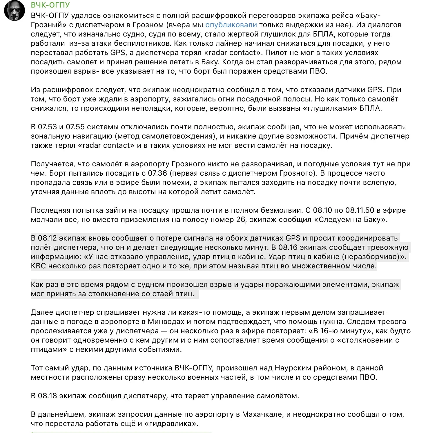 Καθώς το αεροσκάφος πλησίαζε στο αεροδρόμιο του Γκρόζνι στην Τσετσενία, οι πιλότοι προσπαθούσαν να διατηρήσουν τον έλεγχο. Σύμφωνα με τη Daily Mail, που επικαλείται διαρροή των επικοινωνιών με την υπηρεσία ελέγχου εναέριας κυκλοφορίας (ΕΕΚ), η κατάσταση ήταν εκτός ελέγχου ενώ οι πιλότοι υπέθεσαν λανθασμένα ότι συγκρούστηκαν με σμήνος πουλιών.