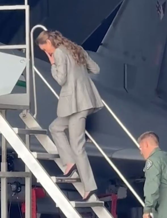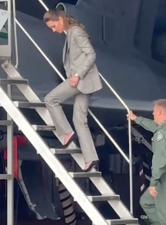 Έβαλε τον καλύτερο εαυτό της στη μόδα, φορώντας ένα κομψό γκρι καρό κοστούμι Bella Freud, το οποίο συνδύασε με ένα τοπ από τον Alexander McQueen. Αλλά εξέπληξε επίσης τους παρατηρητές με την ικανότητά της να ανεβοκατεβαίνει άψογα τις σκάλες επιβίβασης του μαχητικού με τα «ναυτικά στιλέτο» της Stuart Weitzman.
