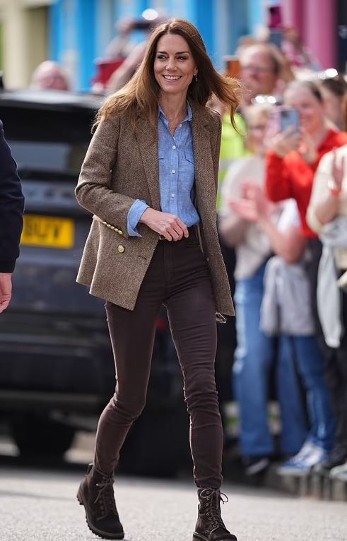 Η Κέιτ, 43 ετών, έλαμπε καθώς εμφανίστηκε με ένα κομψό, τουίντ σακάκι, ψαροκόκαλο αξίας 549 λιρών από την Holland Cooper. Η Κέιτ έφτασε έφτασε στο εμβληματικό αλιευτικό λιμάνι του 18ου αιώνα με τα έντονα χρωματιστά σπίτια, που έγινε διάσημο από την επιτυχημένη παιδική σειρά Balamory, με τον πρίγκιπα Ουίλιαμ.