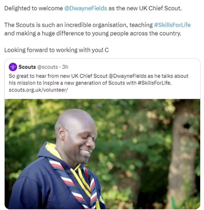 Έγραψε: “Με χαρά καλωσορίζω τον @DwayneFields ως τον νέο επικεφαλής πρόσκοπο του Ηνωμένου Βασιλείου. Οι πρόσκοποι είναι μια τόσο απίστευτη οργάνωση, που διδάσκει #SkillsForLife και κάνει τεράστια διαφορά στους νέους σε όλη τη χώρα. Ανυπομονώ να δουλέψω μαζί σου! C.”