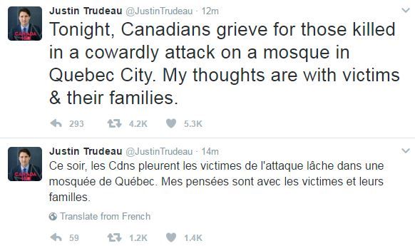 «Απόψε, όλοι οι Καναδοί είναι θλιμμένοι για αυτούς που σκοτώθηκαν από την άνανδρη επίθεση στο τέμενος στο Κεμπέκ, οι σκέψεις μου είναι στα θύματα και στις οικογένειες τους», έγραψε χαρακτηριστικά ο Τριντό.