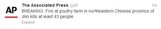 Φωτιά που ξέσπασε σε πτηνοτροφική μονάδα στην βορειοανατολική Κίνα, στην περιοχή της Τζιλίν, είχε ως αποτέλεσμα να χάσουν τη ζωή τους, τουλάχιστον 43 άνθρωποι, μετέδωσε το Associated Press.