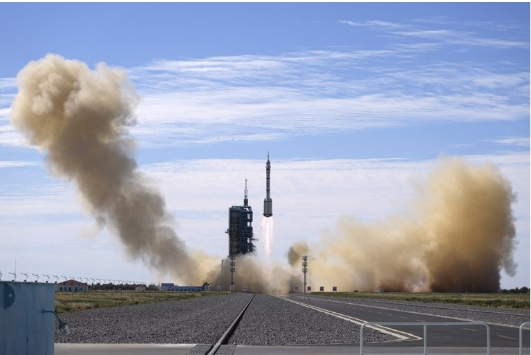 Μέσα σε ένα πελώριο νέφος γκρίζου καπνού, ο πύραυλος Long March 2F που μεταφέρει το διαστημόπλοιο Shenzhou-12, στο οποίο επιβαίνουν τρεις αστροναύτες, απογειώθηκε από το κέντρο διαστημικών εκτοξεύσεων της Τζιουτσουάν, στην έρημο Γκόμπι, στις 09:22 ώρα Πεκίνου (04:22 ώρα Ελλάδας).