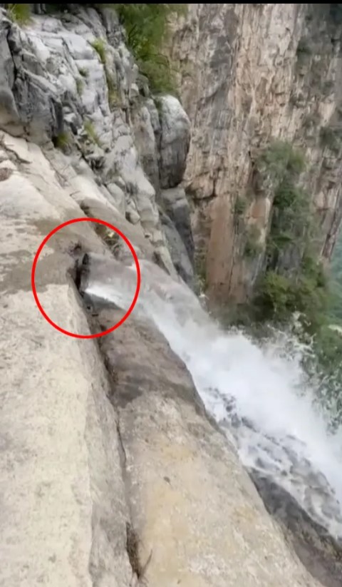 Στο βίντεο φαίνεται ο άνδρας που εντοπίζει έναν σωλήνα ο οποίος τροφοδοτεί με νερό τον καταρράκτη σε ύψος 304 μέτρων. Ο σωλήνας βρίσκεται ψηλά κρυμμένος μέσα σε έναν βράχο.