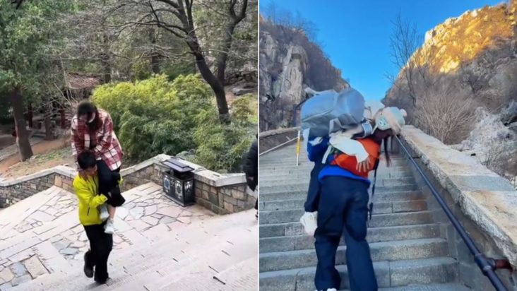 Ένας 26χρονος ξεναγός στο όρος Τάι της επαρχίας Σαντόνγκ στην Κίνα έχει βρει έναν ασυνήθιστο τρόπο να βγάζει χρήματα: κουβαλώντας στα χέρια του τουρίστριες που δεν αντέχουν να ανέβουν τα τελευταία 1.000 σκαλοπάτια μέχρι την κορυφή.
