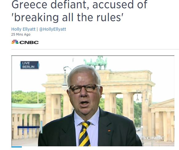 Είπε στο CNBC ότι είναι ζήτημα της Ελλάδας να αποφασίσει αν θα μείνει ή αν θα φύγει από το ευρώ. «Το ερώτημα δεν είναι εάν είμαστε έτοιμοι (να φύγει η Ελλάδα από ευρώ), το ερώτημα είναι είναι τι θέλει να κάνει η Ελλάδα», τόνισε.