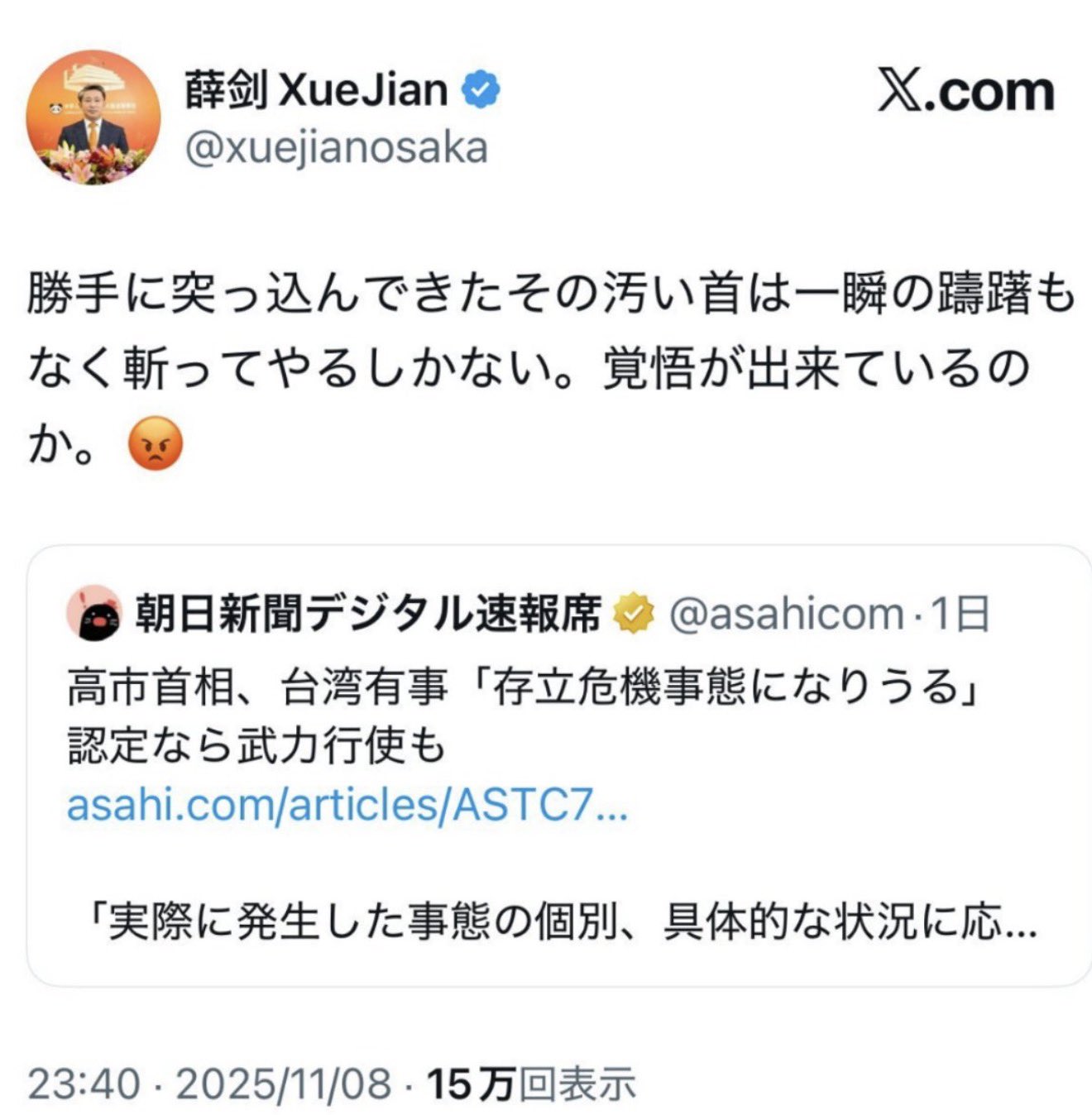 Σε ανάρτηση που έκανε το Σάββατο στο Χ ο Κινέζος γενικός πρόξενος στην Οσάκα, Σουε Τζιάν – ανάρτηση που έπειτα διεγράφη – απείλησε να «κόψει χωρίς τον παραμικρό δισταγμό αυτό το άθλιο κεφάλι».