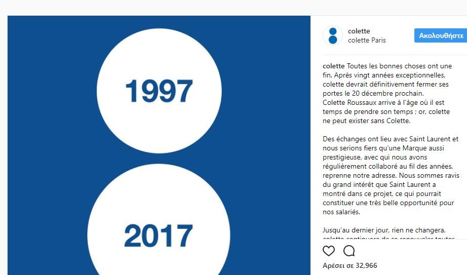 Πριν από δύο χρόνια, ο «Forbes» είχε χαρακτηρίσει την μπουτίκ Colette, στην οδό Σεντ-Ονορέ στο Παρίσι, ως το «trendiest store in the world». Δυστυχώς αυτή η μπουτίκ, που καθόριζε επί 20 χρόνια τις τάσεις στη μόδα, βάζει λουκέτο τον Δεκέμβριο.