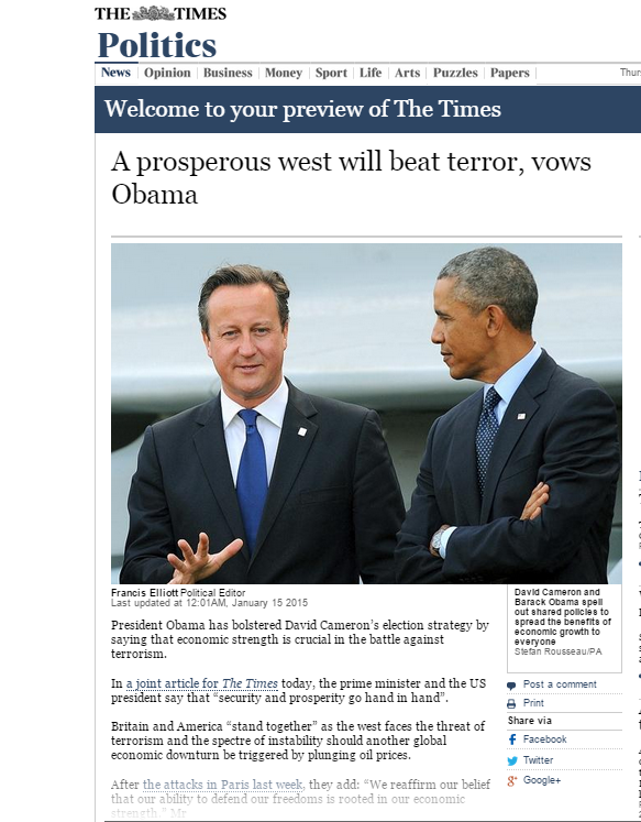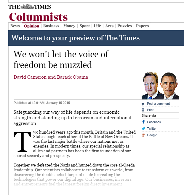 «Θα συνεχίσουμε να είμαστε ενωμένοι ενάντια σε εκείνους που απειλούν τις αξίες μας και τον τρόπο ζωής μας», γράφουν οι Κάμερον και Ομπάμα σε αυτό το άρθρο που δημοσιεύεται την Πέμπτη στην έκδοση της βρετανικής εφημερίδας The Times, αλλά ήδη αναρτήθηκε από το βράδυ της Τετάρτης στην ιστοσελίδα της εφημερίδας. «Θα ξεπεράσουμε αυτές τις βάρβαρες δολοφονίες και τη λανθασμένη ιδεολογία τους, που επιχειρεί να δικαιολογήσει τη δολοφονία αθώων», αναφέρουν οι δυο ηγέτες στο κοινό του άρθρο.