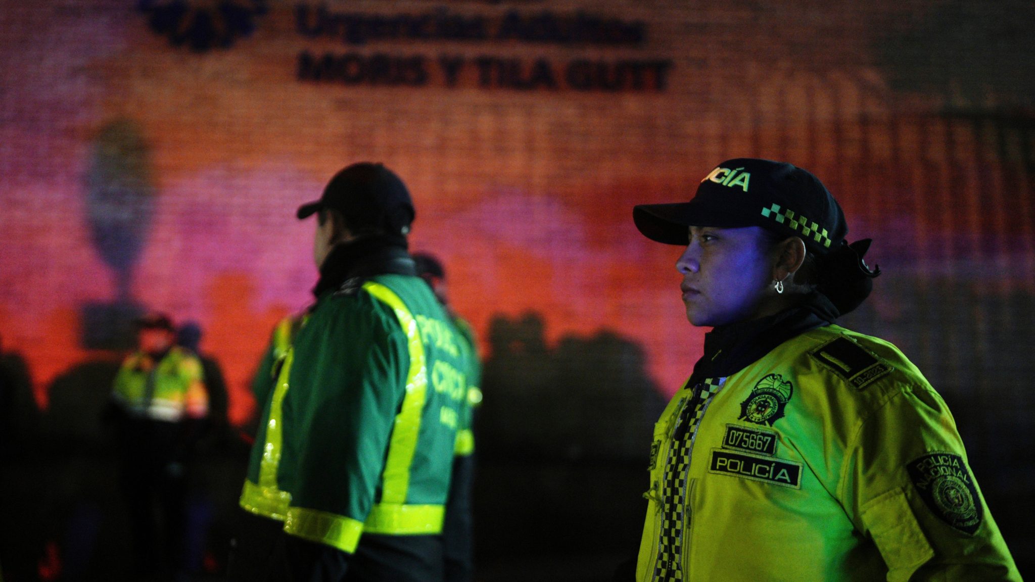 Police stand guard outside the Santa Fe hospital where Colombian senator and presidential candidate Miguel Uribe Turbay is being treated after he was shot during a campaign rally in Bogota, Colombia, Saturday, June 7, 2025. (AP Photo/Ivan Valencia)