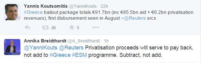 Σχολιάζοντας μήνυμα στο Twitter που αναφέρεται σε τηλεγράφημα του Reuters για το πακέτο βοήθειας στην Ελλάδα μετά την επικύρωση της συμφωνίας, η Αννίκα Μπράιτχαρτ, εκπρόσωπος της Κομισιόν, ξεκαθαρίζει ότι τα χρήματα των ιδιωτικοποιήσεων αφαιρούνται και δεν προστίθενται στην βοήθεια και θα χρησιμοποιηθούν για αποπληρωμή του χρέους.