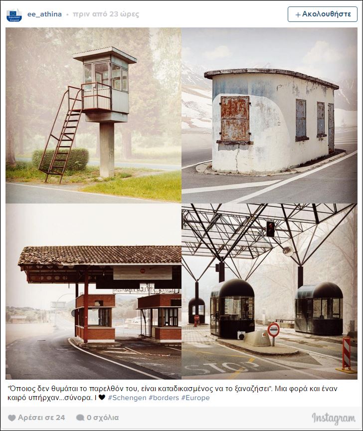 «Όποιος δεν θυμάται το παρελθόν του, είναι καταδικασμένος να το ξαναζήσει. Μια φορά και έναν καιρό υπήρχαν… σύνορα» αναφέρει το Γραφείο της Ευρωπαϊκής Επιτροπής στην Αθήνα σε μια… «κυνική» ανάρτηση στο Instagram, όπου παρουσιάζει φωτογραφίες από παλιά κτίρια ελέγχου των συνόρων.