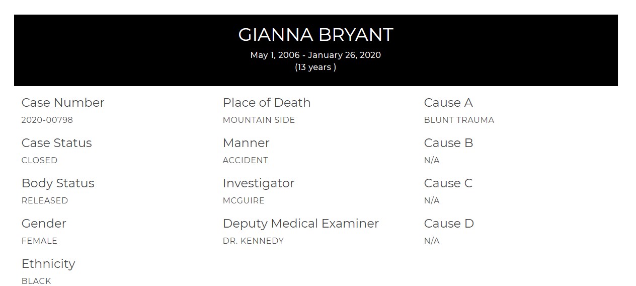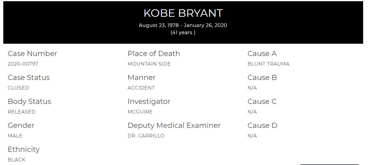 Το γραφείο του ιατροδικαστή του Λος Άντζελες έδωσε στη δημοσιότητα τη νεκροψία των εννέα θυμάτων από το τραγικό δυστύχημα του Ιανουαρίου με το ελικόπτερο που μετέφερε τον Κόμπι Μπράιαντ και την κόρη του Τζίτζι. Οι ιατροδικαστικές εκθέσεις για όλα τα θύματα δείχνουν ότι όλοι πέθαναν από την ίδια αιτία, από αμβλύ τραύμα. Τα αποτελέσματα αναρτήθηκαν στην ιστοσελίδα του Los Angeles County Medical Examiner-Coroner λίγο μετά τις 6 το απόγευμα (τοπική ώρα).