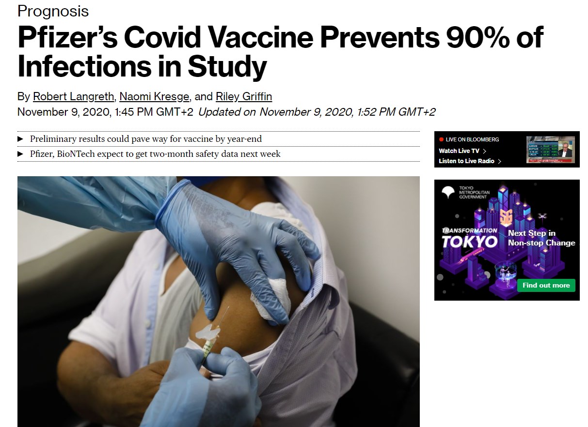 Το εμβόλιο κατά του κορονοϊού που αναπτύσσεται από τις Pfizer και Biontech είναι «αποτελεσματικό πάνω από 90%», όπως αναφέρει το Bloomberg. Οκτώ μήνες από την χειρότερη πανδημία του αιώνα, τα πρώτα αποτελέσματα “στρώνουν” τον δρόμο για τις εταιρείες για να υποβάλλουν αίτηση για έκτακτη χρήση από τις Αρχές, αν η περαιτέρω έρευνα δείξει ότι το εμβόλιο είναι επίσης ασφαλές.