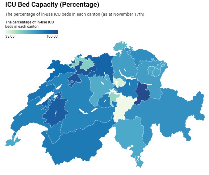 Αυτή τη στιγμή υπάρχουν 240 δωρεάν κρεβάτια εντατικής θεραπείας σε ολόκληρη τη χώρα – μόλις το 21% της συνολικής κατανομής. Ωστόσο, σε μεμονωμένα καντόνια, οι μονάδες εντατικής θεραπείας βρίσκονται κοντά στο όριο χωρητικότητας ή πάνω. Η κατάσταση είναι ιδιαίτερα τρομερή στο Aargau, το Fribourg και το Solothurn, όπου η χωρητικότητα έχει ήδη ξεπεράσει το 90% – ενώ στη Glarus ICU οι ασθενείς έχουν ήδη υπερβεί την ικανότητα του καντονίου.