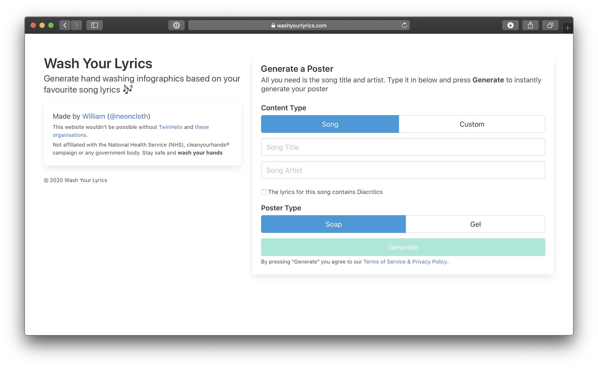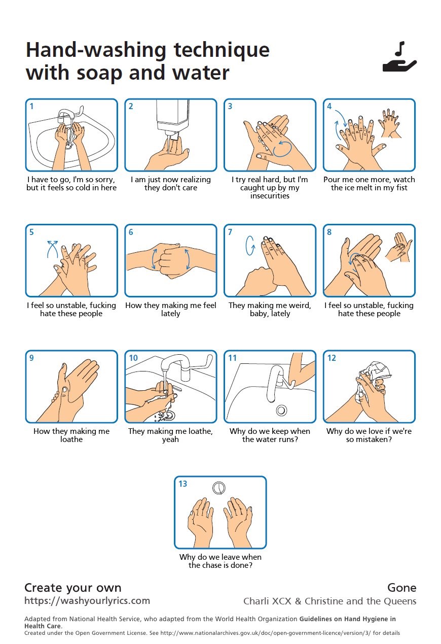 Ένας 17χρονος ήθελε να βοηθήσει στη μάχη κατά της εξάπλωσης του κορονοϊού και αποφάσισε να δημιουργήσει έναν ιστότοπο που δημιουργεί αφίσες με τις οδηγίες πλυσίματος των χεριών με στιχάκια διάσημων τραγουδιών. Κάθε χρήστης που μπαίνει στο washyourlyrics.com, έχει τη δυνατότητα επιλέγοντας το τραγούδι και τον τραγουδιστή να δημιουργήσει την δική του αφίσα και να την αναρτήσει στα social media. Οι οδηγίες του ΠΟΥ αναφέρουν πώς πρέπει να πλένουμε τα χέρια μας τουλάχιστον για 20 δευτερόλεπτα ή όσο διαρκεί το να τραγουδήσει κάποιος δύο φορές το “Happy Birthday”. Έτσι, αυτή ήταν η αφορμή για την έμπνευση του William Gibson.