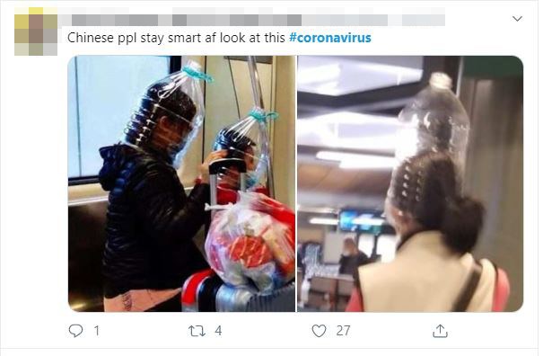 Όπως φαίνεται στις φωτογραφίες κάποιοι έκοψαν μεγάλα πλαστικά μπουκάλια και τα φορούν σαν “κράνη” στο κεφάλι, ένας επιβάτης σε αεροπλάνο φορούσε κράνος κατά τη διάρκεια της πτήσης, άλλοι καλύπτονται με πλαστικές σακούλες και άλλοι φορούν τις κλασικές χειρουργικές μάσκες. Οι χρήστες που ανέβασαν τις συγκεκριμένες φωτογραφίες στα social media ισχυρίζονται ότι στην απόγνωση του ο κόσμος στην Κίνα λαμβάνει ακραία μέτρα για να μην προσβληθεί από τον νέο κορονοϊό.