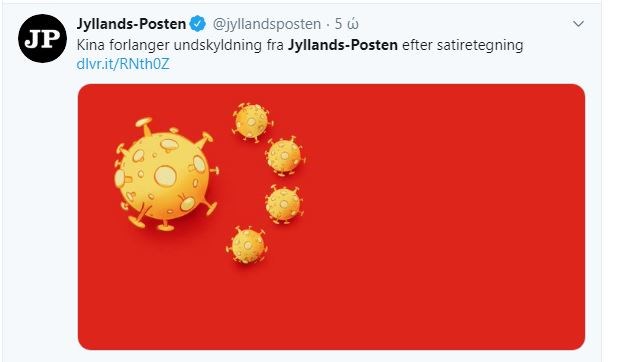 Ένα σκίτσο που δημοσίευσε η δανέζικη εφημερίδα Jyllands-Posten και απεικονίζει την κινεζική σημαία να φέρει, αντί των πέντε κίτρινων αστεριών, σωματίδια του κορονοϊού προκάλεσε την έντονη αντίδραση της Κίνας.