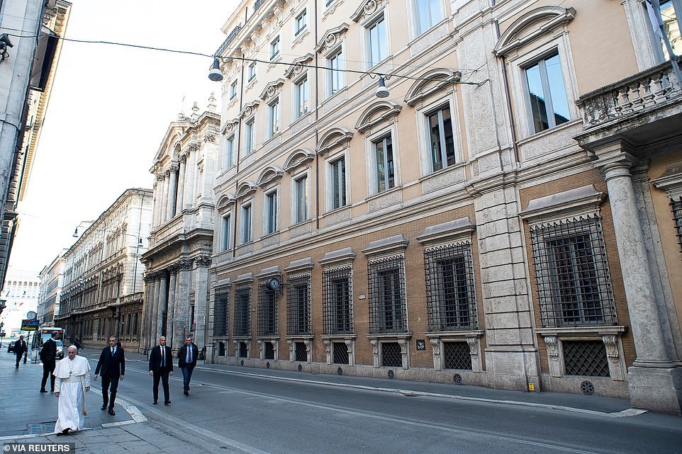 Σοκαριστική είναι και η εικόνα της πλατείας του Αγίου Πέτρου στο Βατικανό όπου δεν υπάρχει κανείς άνθρωπος, στη συνήθως κοσμοπλημμυρισμένη πλατεία, ιδίως σε περίοδο Σαρακοστής. Μόνο μία γυναίκα φορώντας μάσκα στέκεται μακριά στην πλατεία ακούγοντας τις ευλογίες του Πάπα.