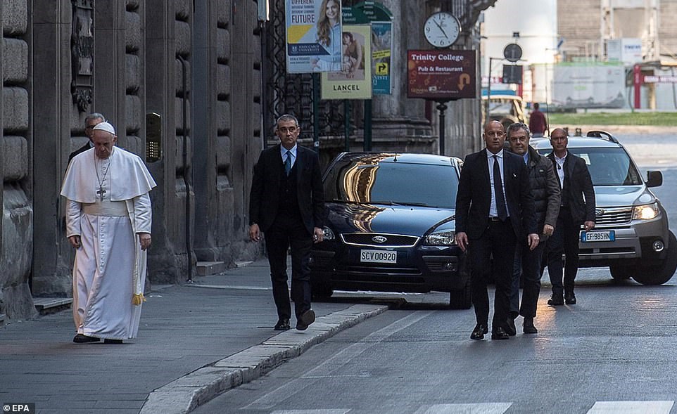Συγκλονίζει η εικόνα της ερημωμένης Ρώμης, καθώς οι Ιταλοί παραμένουν στα σπίτια τους για να πολεμήσουν την εξάπλωση του κορονοϊού. Ο Πάπας Φραγκίσκος περπάτησε σήμερα σ’ αυτούς τους δρόμους και έστειλε τις δικές του ευλογίες. Ο Προκαθήμενος της Ρωμαιοκαθολικής Εκκλησίας συνοδευόταν από μερικούς άνδρες της ασφάλειάς του που περπατούν μαζί του λίγα μέτρα μακριά του, ενώ ο Ποντίφικας περνά από τους έρημους δρόμους και τα εγκαταλελειμμένα πλακόστρωτα στενά.