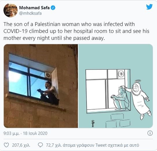 Ένα άκρως συγκινητικό φωτογραφικό στιγμιότυπο δημοσίευσε στον λογαριασμό του στο Twitter ο εκπρόσωπος των Ηνωμένων Εθνών και γνωστός ακτιβιστής, Μοχάμεντ Σάφα. Σ’ αυτό απεικονίζεται ένας άνδρας από την Παλαιστινή να έχει σκαρφαλώσει στο παράθυρο της ΜΕΘ σε νοσοκομείο της πόλης του για να αποχαιρετίσει τη μητέρα του που πέθαινε από κορονοϊό.