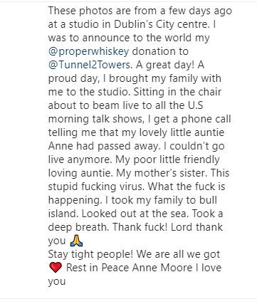 Σε μια μακροσκελή ανάρτηση συμβουλεύει τους ακολούθους του να αποφεύγουν τις χειραψίες, κάτι που προτρέπει ακόμη και τον εαυτό του, ενώ στη συνέχεια ενημερώνει πως βρισκόταν σε τηλεοπτικό στούντιο για συνέντευξη όταν ενημερώθηκε για τον θάνατο της πολυαγαπημένης του θείας και έτσι πήρε την οικογένειά του που ήταν μαζί του και τους πήγε στο νησί Μπουλ ενώ ξεσπά κατά του κορονοϊού, χωρίς ωστόσο να αναφέρει λεπτομέρειες για την αιτία θανάτου της θείας του. Το κείμενό του συνοδεύουν διάφορες φωτογραφίες από την οικογένειά του.