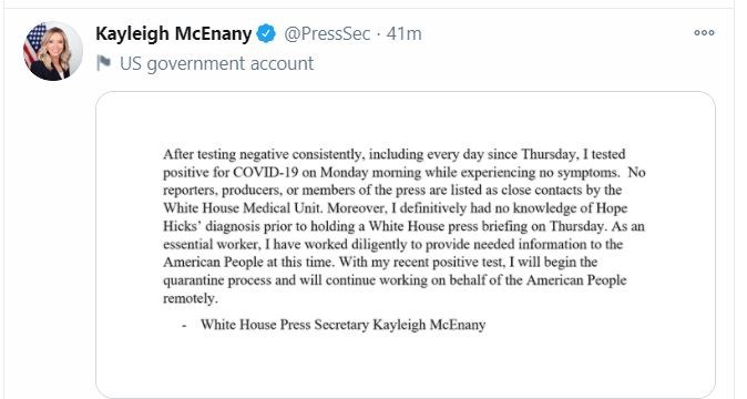 Τρεις μέρες μετά την εισαγωγή σε νοσοκομείο του Αμερικανού προέδρου, Ντόναλντ Τραμπ, θετική διαγνώστηκε και η Κέιλι ΜακΕνάνι, εκπρόσωπος τύπου του Λευκού Οίκου Κέιλι ΜακΕνάνι. Η ίδια το ανακοίνωσε μέσω twitter: «Αφού είχα επανειλημμένως αρνητικά αποτελέσματα στις εξετάσεις για την Covid-19, κάθε ημέρα από την Πέμπτη, διαγνώστηκα θετική σήμερα στην Covid-19, χωρίς να έχω εκδηλώσει συμπτώματα», έγραψε σε ανάρτησή της στο Twitter ενώ πρόσθεσε ότι η ιατρική ομάδα του Λευκού Οίκου δεν έχει καταγράψει κανένα μέλος του Τύπου ως στενή επαφή της.