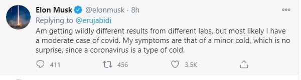 «Λαμβάνω εντελώς διαφορετικά αποτελέσματα από διαφορετικά εργαστήρια, αλλά το πιθανότερο είναι ότι είμαι ήπια περίπτωση της COVID-19. Τα συμπτώματά μου είναι αυτά ενός μικρού κρυώματος, το οποίο δεν αποτελεί έκπληξη, καθώς ο κορονοϊός είναι ένας τύπος κρυώματος», ανέφερε ο Μασκ σε ανάρτησή του στο Twitter.