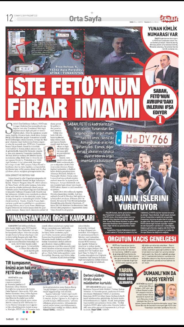 Νέα ένταση στις Ελληνοτουρκικές σχέσεις προκαλεί πρωτοσέλιδο Τουρκικής εφημερίδας, που χαρακτηρίζει κρησφύγετο Γκιουλενιστών την Ελλάδα.Η εφημερίδα Sabah, στο δημοσίευμά της, παρουσιάζει φωτογραφίες φερόμενου ως ηγετικού στελέχους στην Αθήνα, παραθέτοντας μάλιστα τα πλήρη στοιχεία τουΣύμφωνα με την εφημερίδα το ηγετικό στέλεχος ονομάζεται Yalcin Eskek και διαμένει επί της οδού Πραξιτέλους 4 στην Αγία Παρασκευή.Το ρεπορτάζ υπογράφουν οι Τούρκοι δημοσιογράφοι οι οποίοι είχαν προσαχθεί στην Ασφάλεια Αττικής στις 19 Φεβρουαρίου, καθώς η δραστηριότητά τους έξω από σχολείο στην Αγία Παρασκευή κρίθηκε ύποπτη.Δείτε το δημοσίευμα: