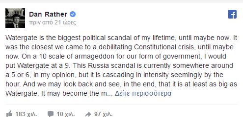 Μάλιστα τις τελευταίες ώρες ιδιαίτερη αίσθηση κάνουν τα όσα γράφει στο facebook o διάσημος δημοσιογράφος Νταν Ράδερ, ο οποίος είχε καλύψει ως ανταποκριτής στον Λευκό Οίκο το σκάνδαλο που κόστισε στον Νίξον την εξουσία.