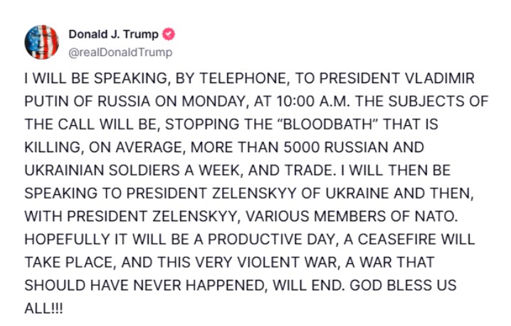 «Τα θέματα της συνομιλίας θα είναι να τερματιστεί ‘το λουτρό αίματος’ που σκοτώνει κατά μέσο όρο περισσότερους από 5.000 Ρώσους και Ουκρανούς στρατιώτες την εβδομάδα και το εμπόριο», έγραψε ο Αμερικανός πρόεδρος.