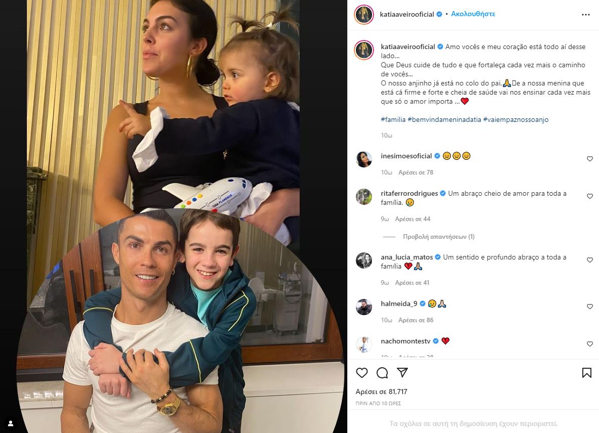 Η αδελφή του Κριστιάνο Ρονάλντο, Κάτια Αβέιρο, έστειλε συγκινητικό μήνυμα μετά τον θάνατο του γιου του. Ο ποδοσφαιριστής και η σύντροφός του, Τζορτζίνα Ροντρίγκεζ γνωστοποίησαν χθες το βράδυ με κοινό μήνυμά τους την τραγική είδηση