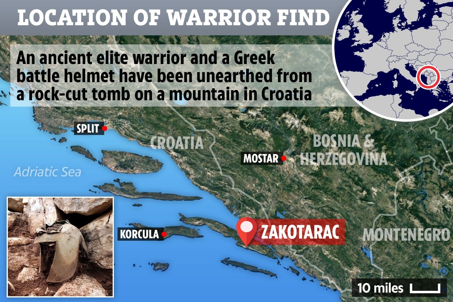 Το κράνος ανακαλύφθηκε στις 20 Νοεμβρίου, στο Ζακοτάρακ, στη νότια Δαλματία της Κροατίας, μέσα σε ταφικό σπήλαιο ενός πολεμιστή του 4ου αιώνα π.Χ. Σύμφωνα με τη Daily Mail, πρόκειται για ένα «ιλλυρικό κράνος» που έχει διατηρήσει μετά από τόσους αιώνες τον εμβληματικό σχεδιασμό του. Ο αρχαιολογικός όρος «ιλλυρικό κράνος» περιγράφει έναν τύπο ορειχάλκινης περικεφαλαίας που χρησιμοποιούνταν ευρύτατα κατά τον 8ο και 7ο π.Χ. αιώνα, ειδικά στην Πελοπόννησο, που ήταν και ο τόπος της πρωιμότερης εξέλιξής του. Το συγκεκριμένο κράνος χρησιμοποιούσαν και οι αρχαίοι Ετρούσκοι και οι Σκύθες, ενώ αργότερα έγινε δημοφιλές στη φυλή των Ιλλυριών.