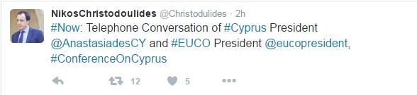 Στο μεταξύ, ο Πρόεδρος Νίκος Αναστασιάδης επικοινώνησε το πρωί τηλεφωνικώς με τον Πρόεδρο του Ευρωπαϊκού Συμβουλίου Ντόναλντ Τουσκ, στο πλαίσιο των συνεχιζόμενων επαφών του για το Κυπριακό. Σε ανάρτηση στον προσωπικό λογαριασμό του στο Twitter, ο κυβερνητικός εκπρόσωπος ανέφερε ότι αντικείμενο και αυτής της τηλεφωνικής συνδιάλεξης ήταν η Διάσκεψη για την Κύπρο.