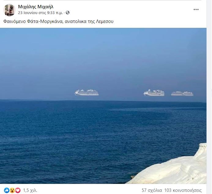 Ένα ασυνήθιστο και εντυπωσιακό φαινόμενο, αυτό της “Φάτα Μοργκάνα” εμφανίστηκε στην Κύπρο και συγκεκριμένα ανατολικά της Λεμεσού. Στη φωτογραφία που δημοσιεύτηκε στο Facebook στη σελίδα “Καιρόφιλοι Κύπρου”, απεικονίζονται κρουαζιερόπλοια να “αιωρούνται”. Τι είναι όμως, η “Φάτα Μοργκάνα”;