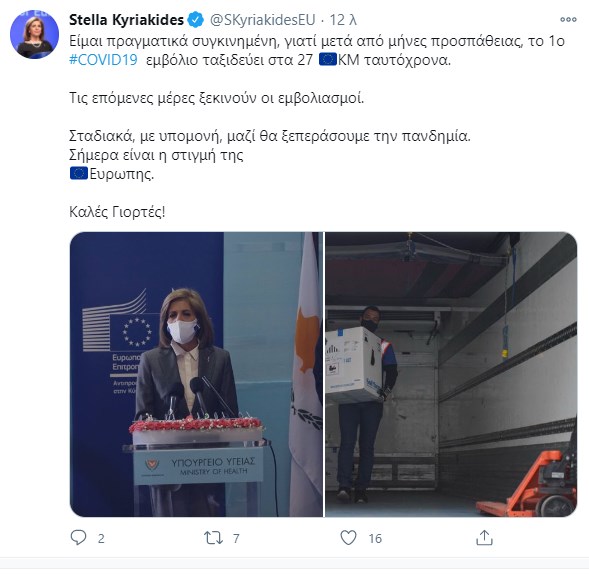 Η Ευρωπαία Επίτροπος με ανάρτησή της στον επίσημο λογαριασμό της στο twitter ανέφερε: «Αυτή είναι μια συναισθηματική στιγμή. Μετά από μήνες σκληρής δουλειάς, έφτασε η ημέρα των πρώτων αποστολών εμβολίων COVID-19. Χιλιάδες δόσεις παραδίδονται σήμερα σε όλα τα κράτη- μέλη της Ευρωπαϊκής Ένωσης ταυτόχρονα. Αυτή είναι η ευρωπαϊκή αλληλεγγύη και η ενότητα στην πράξη».