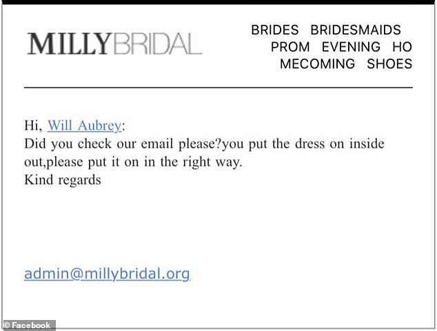 Συγκεκριμένα, η εταιρεία απάντησε στο mail της και της γνωστοποίησε ότι το είχε φορέσει ανάποδα -δηλαδή το μέσα-έξω. «Φοράτε το φόρεμα, το μέσα έξω. Παρακαλώ βάλτε το με τον σωστό τρόπο», ήταν η απάντηση της εταιρείας. Παρά την αρχική της αμηχανία, η Όμπρεϊ, όπως λέγεται η μέλλουσα νύφη φαίνεται ότι έχει αίσθηση του χιούμορ και μοιράστηκε το λάθος της, σε μια ομάδα για νύφες στο Facebook.