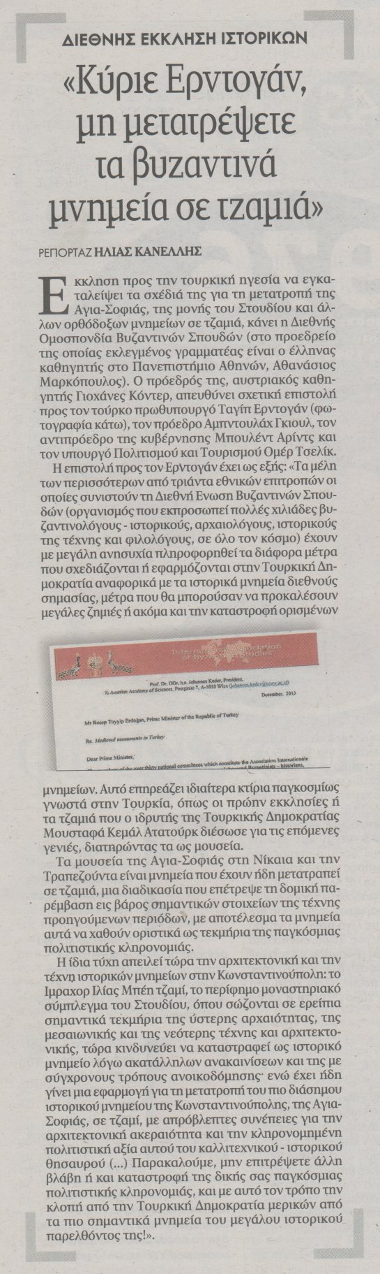 Έκκληση προς την τουρκική ηγεσία να εγκαταλείψει τα σχέδιά της για τη μετατροπή της Αγια-Σοφιάς, της μονής του Στουδίου και άλλων ορθόδοξων μνημείων σε τζαμιά, κάνει η Διεθνής Ομοσπονδία Βυζαντινών Σπουδών (στο προεδρείο της οποίας εκλεγμένος γραμματέας είναι ο Έλληνας καθηγητής στο Πανεπιστήμιο Αθηνών, Αθανάσιος Μαρκόπουλος). Ο πρόεδρος της, Αυστριακός καθηγητής Γιοχάνες Κόντερ, απευθύνει σχετική επιστολή προς τον Τούρκο Πρωθυπουργό Ταγίπ Ερντογάν, τον πρόεδρο Αμπντουλάχ Αρίντς και τον υπουργό Πολιτισμού και Τουρισμού Ομέρ Τσελίκ.