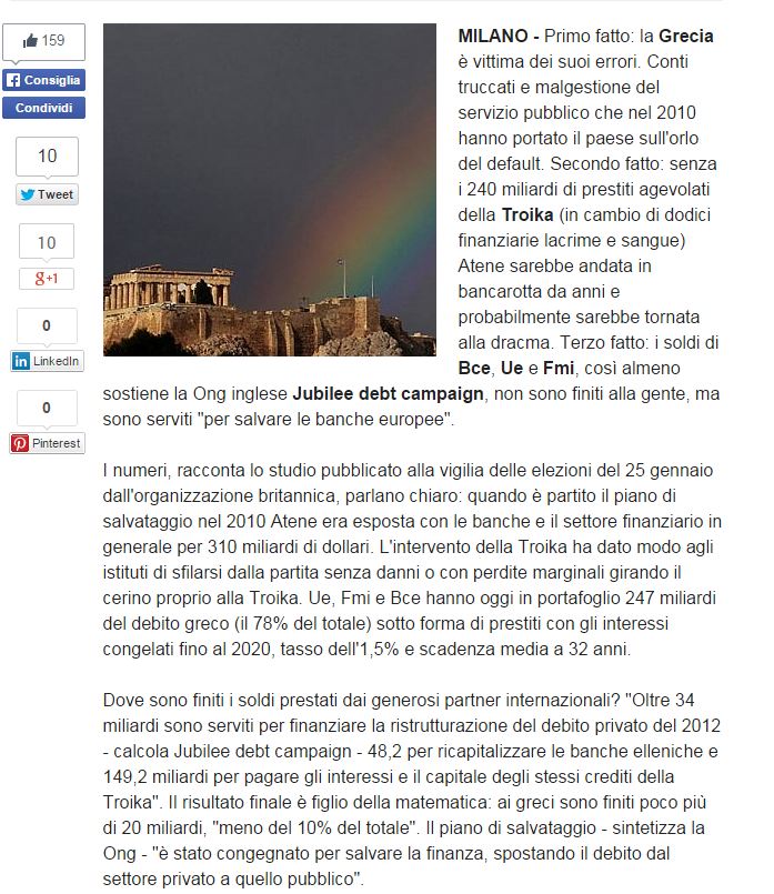 «Αθήνα, οι κατηγορίες στην Τρόικα: σώθηκαν οι τράπεζες και όχι οι Έλληνες», τιτλοφορεί άρθρο της ιταλικής εφημερίδας La Repubblica, το οποίο δημοσιεύει στην διαδικτυακή της πύλη, με αναφορά σε μελέτη της βρετανικής μη κυβερνητικής οργάνωσης Jubilee Debt Campaign.