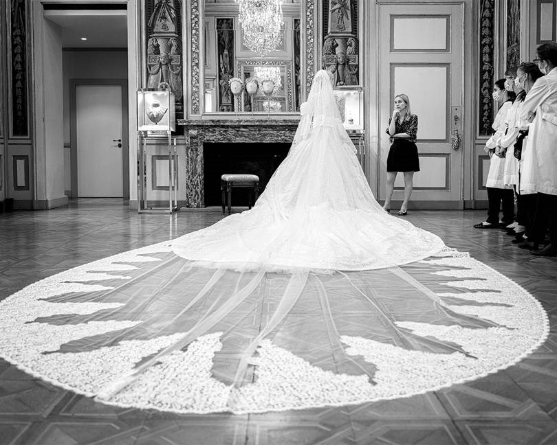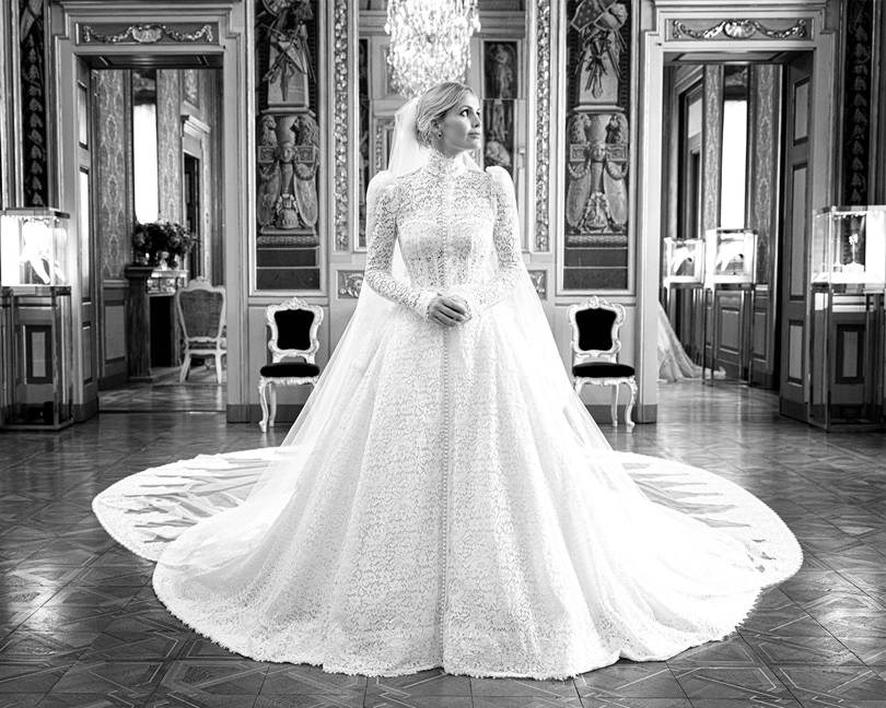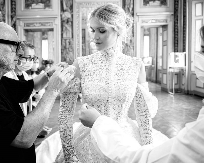 Η 30χρονη επέλεξε ένα νυφικό από τον οίκο Dolce & Gabbana, άλλωστε έχει φορέσει αρκετά ρούχα του οίκου μόδας ως μοντέλο από το 2017. Η μοναδική δημιουργία ήταν από δαντέλα με μακριά μανίκια και ψηλό λαιμό, ενώ η νύφη φόρεσε και ένα μακρύ πέπλο. Σχολιάστηκε ιδιαίτερα ότι η νύφη εκτός από το νυφικό, φόρεσε ακόμη τέσσερις δημιουργίες κατά τη διάρκεια της δεξίωσης, ανανεώνοντας το χτένισμα και το μακιγιάζ της ανάλογα.