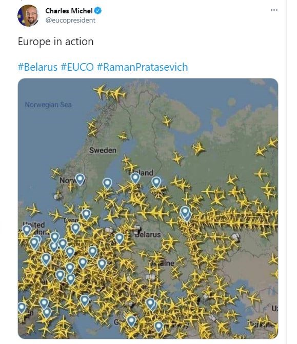 Αυτό έχει ως αποτέλεσμα να προκληθεί ένα πρωτόγνωρο… μποτιλιάρισμα πτήσεων γύρω από τον εναέριο χώρο της Λευκορωσίας, όπως φαίνεται σε φωτογραφία που ανέβασε στο twitter ο πρόεδρος του Ευρωπαϊκού Συμβουλίου Σαρλ Μισέλ, ο οποίος, όπως χαρακτηριστικά γράφει “Η Ευρώπη εν δράσει”, αποτυπώνοντας τη δραστηριότητα των πτήσεων στον… ευρωπαϊκό ουρανό.