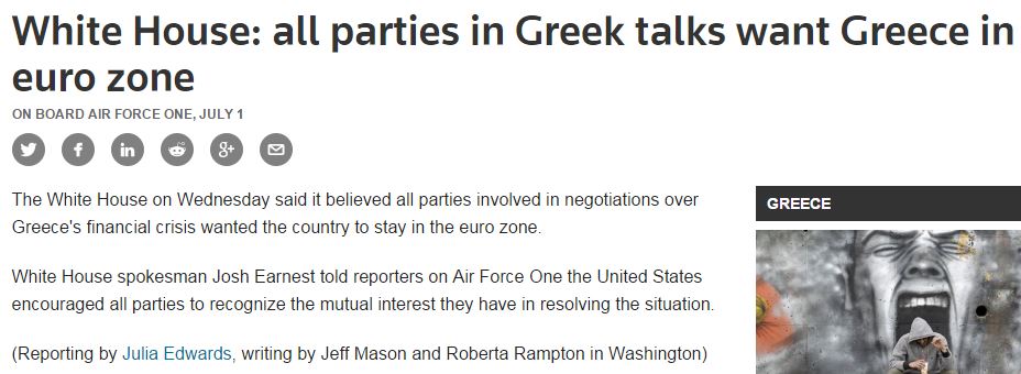 Όλες οι εμπλεκόμενες στις διαπραγματεύσεις πλευρές επιθυμούν η Ελλάδα να παραμείνει στην Ευρωζώνη επισημαίνει ο Λευκός Οίκος, σύμφωνα με το πρακτορείο Reuters.