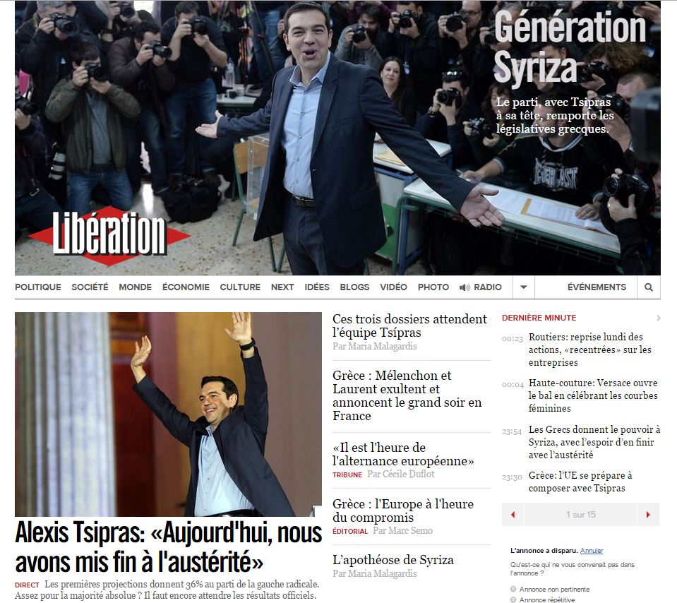 Στο ίδιο κλίμα και η ιστοσελίδα της γαλλικής εφημερίδας έχει αφιερώσει σχεδόν ολόκληρη την αρχική του σελίδα σε δημοσιεύματα που αφορούν τις ελληνικές βουλευτικές εκλογές και τον Αλέξη Τσίπρα.