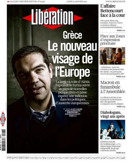 Μια ολοσέλιδη φωτογραφία του Αλέξη Τσίπρα και με τίτλο «Ελλάδα, το νέο πρόσωπο της Ευρώπης» κυκλοφορεί το αυριανό φύλλο της Liberation αφιερωμένο στις ελληνικές εκλογές.