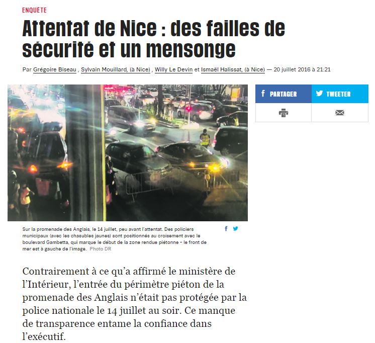 Σε ανακοίνωση που εξέδωσε, ο υπουργός Εσωτερικών Μπερνάρ Καζνέβ δηλώνει ότι το πρώτο μπλόκο που πέρασε το φορτηγό ήταν ένα σημείο εκτροπής της κυκλοφορίας και οπτικού ελέγχου» και ότι «η δημοτική αστυνομία είχε αντικαταστήσει , όπως προβλεπόταν, τη γαλλική αστυνομία στο μπλόκο στο οποίο αναφέρεται το δημοσίευμα, στις 21.00».