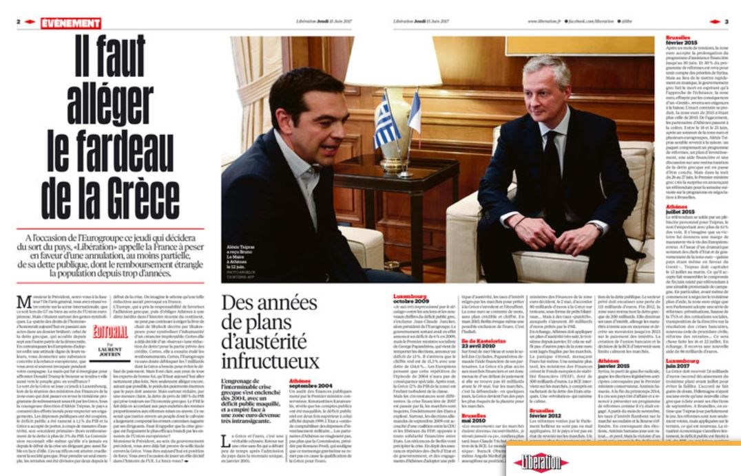«Με την ευκαιρία του Eurogroup σήμερα Πέμπτη, που θα αποφασίσει για την τύχη της χώρας» υπογραμμίζεται στον υπότιτλο «η Liberation καλεί τη Γαλλία να δώσει το βάρος της υπέρ της ακύρωσης τουλάχιστον μέρους του χρέους, η αποπληρωμή του οποίου στραγγαλίζει τον πληθυσμό εδώ και πολλά χρόνια».